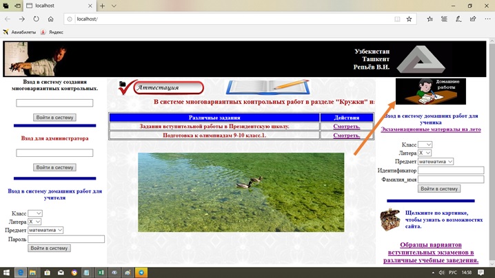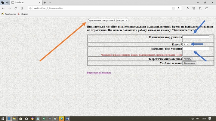 Шаг 3. В раскрывающемся списке, на который указывает красная стрелка, ученик должен установить тему. Далее нужно заполнить поля, на которые указывают синие стрелки. В графе "Идентификатор учителя" ученик должен записать ученический пароль. Этот пароль ученику выдает зарегистрированный учитель. В поле, в котором написано X ученик должен установить литеру своего класса. В поле "Фамилия" ученик должен записать свои фамилию и имя без пробелов. После установки всех этих полей нужно щелкнуть по кнопке "Выполнять".Если щелкнуть по кнопке "Читать", то будет загружен образец выполнения данной работы.