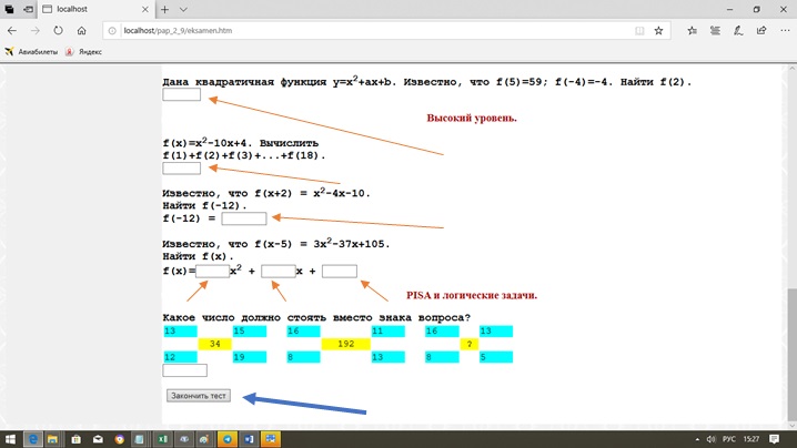 Шаг 4. После щелчка по кнопке "Выполнять" появится работа с вопросами. Ответы нужно записывать в соответствующих полях, на которые указывают красные стрелки. Время на выполнение домашней работы не ограничено. После выполнения работы нужно щелкнуть по кнопке "Закончить тест"